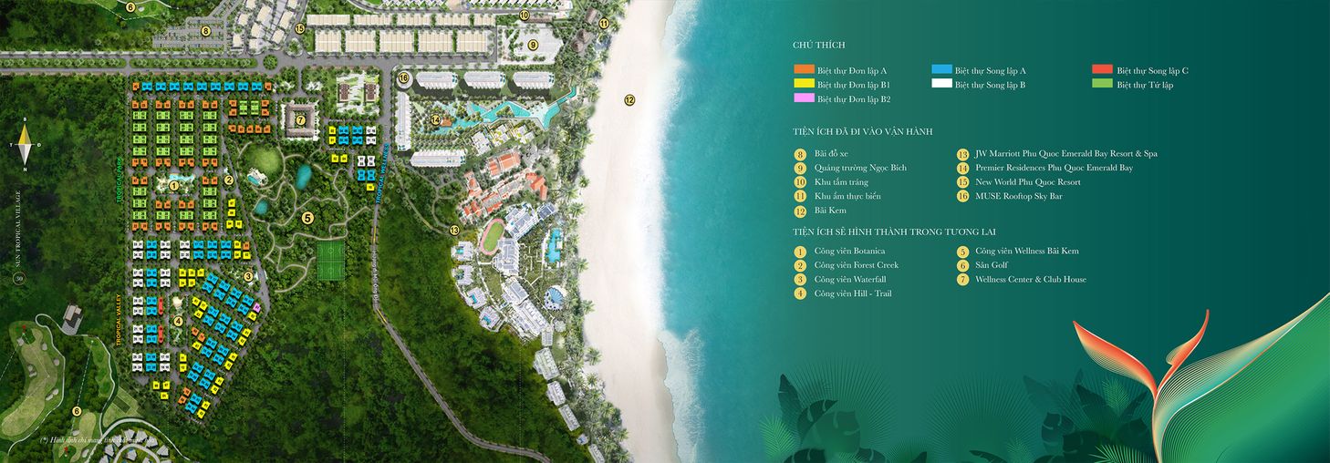Với 3 phân khu: Tropical Wellness, Tropical Park và Tropical Valley, Sun Tropical Village mang đến cho chủ sở hữu tấm thẻ thông hành giữa hai miền đối lập - một bên là rừng xanh yên bình tĩnh lặng, một bên là chốn phồn hoa rực rỡ. Ở đó có những căn biệt thự vườn ẩn mình bên rừng già với bầu không khí trong lành, xanh mát, an yên tĩnh tại, nhưng chỉ cần bước ra ngoài “ngôi làng” ấy, chủ nhân đã có thể hòa mình vào nhịp sống hiện đại, năng động với quần thể nghỉ dưỡng sang trọng được kiến tạo bởi Tập đoàn Sun Group bên Bãi Kem thơ mộng, thế giới dịch vụ cao cấp hiện đại haynhững công trình biểu tượng tại thiên đường biển đảo.